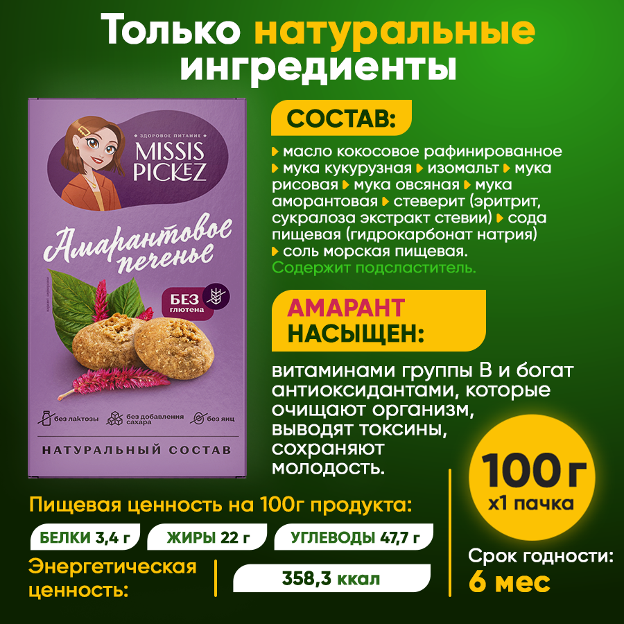 Missis Pickez Печенье Амарантовое без добавления сахара и глютена, без лактозы Натуральное для детского питания Набор - 5 упаковок 1 205 ₽