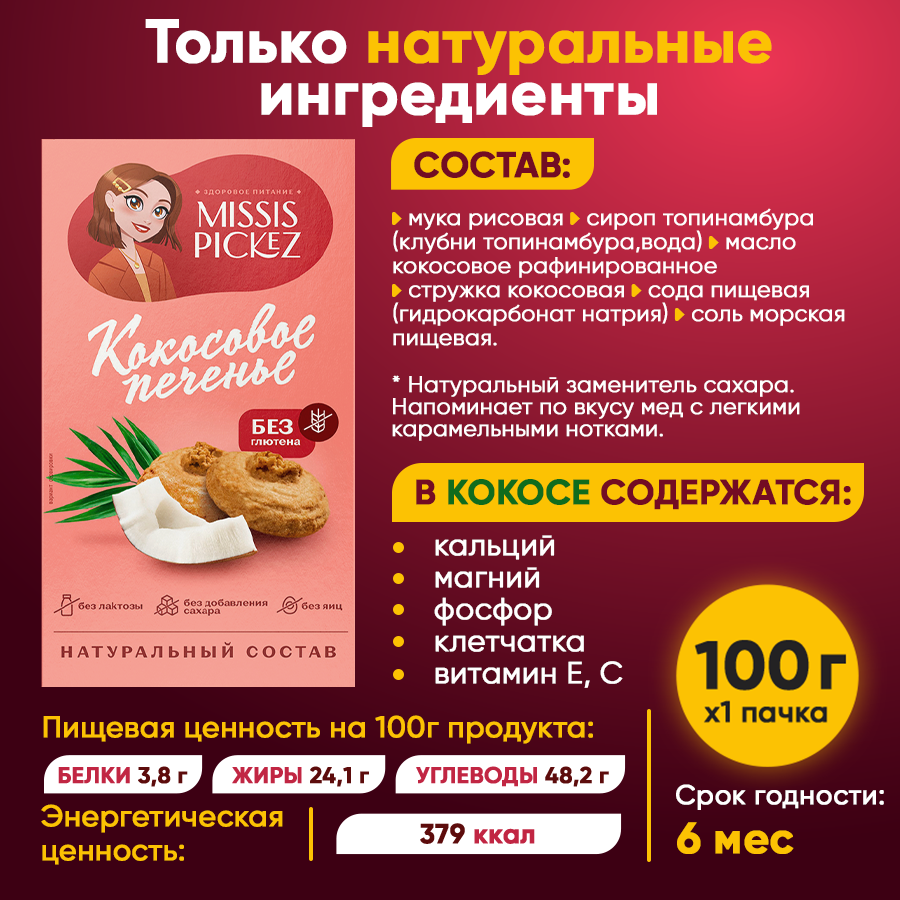 Missis Pickez Печенье Кокосовое без добавления сахара и глютена, без лактозы Натуральное для детского питания Набор - 3 упаковки информация:
