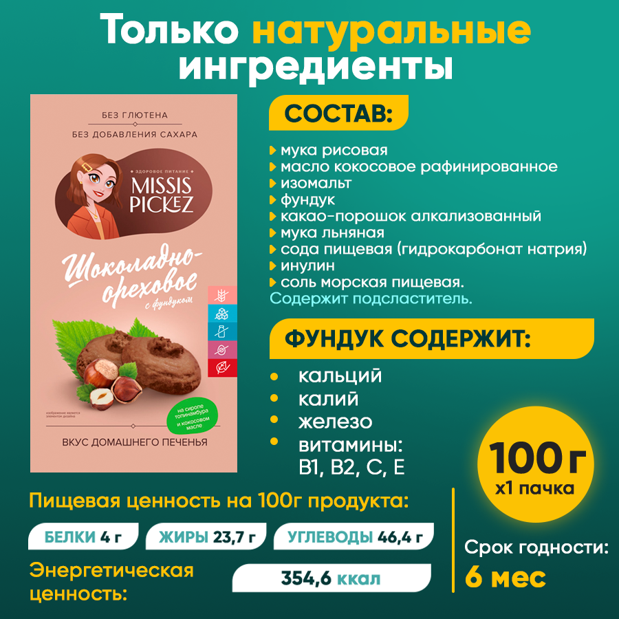 Missis Pickez Печенье Шоколадно-ореховое без добавления сахара и глютена, без лактозы Натуральное для детского питания Набор - 3 упаковки информация: