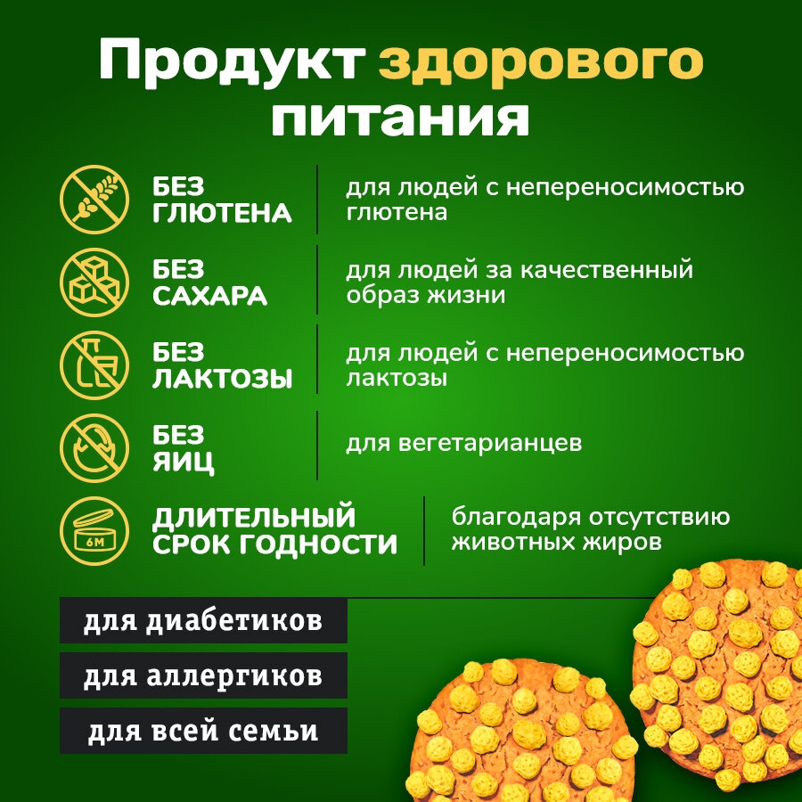 | Не содержит | ГМО / глютен / консерванты / красители / лактозу / пальмовое масло / сахар / яйца |