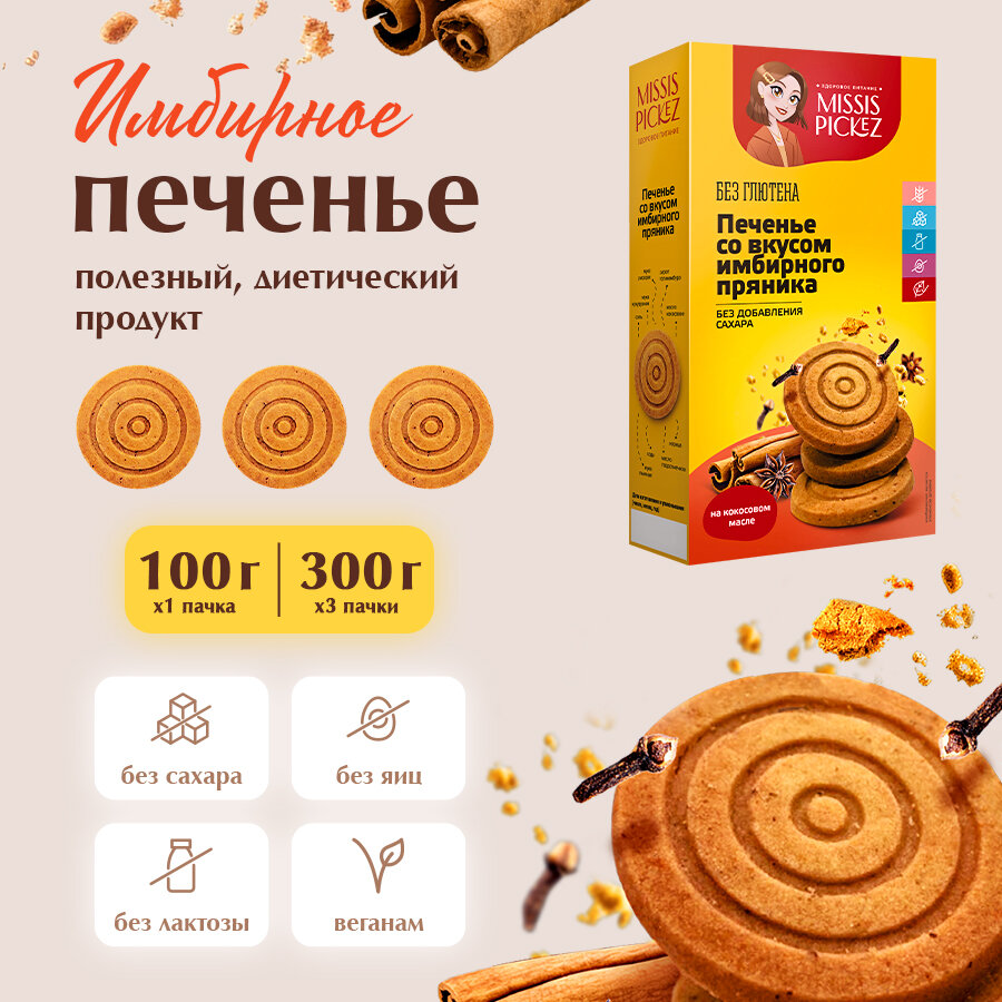 Печенье со вкусом имбирного пряника без сахара без глютена "Missis Pickez" 3 пачки по 100 г 725 ₽