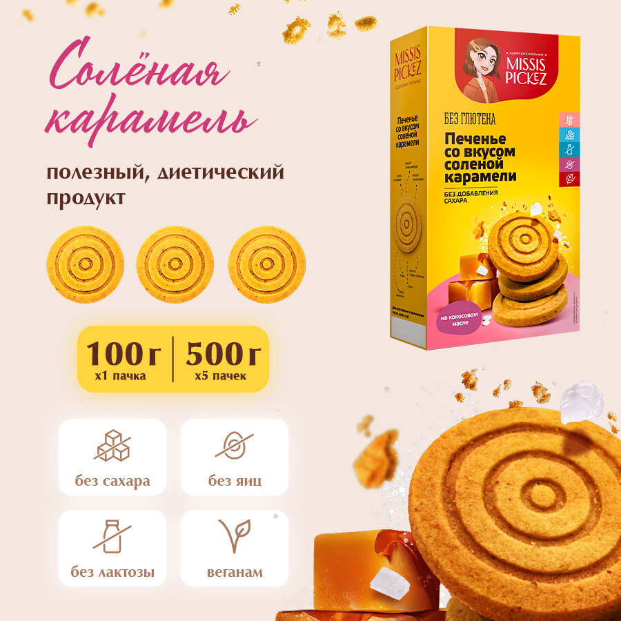 Missis Pickez Печенье со вкусом Соленой карамели без добавления сахара и глютена, без лактозы Натуральное для детского питания Набор - 5 пачек информация: