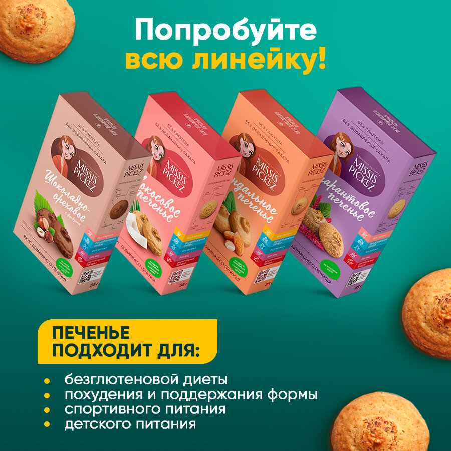 Набор печенья без сахара "Missis Pickez" Амарантовое, кокосовое, миндальное Без лактозы Без глютена Набор - 3 пачки 709 ₽