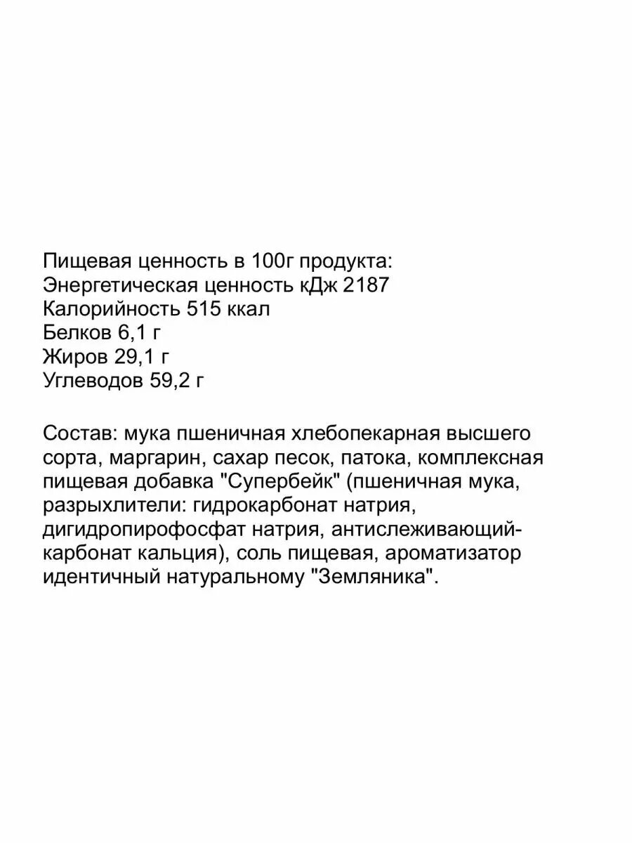 | Состав | мука пшеничная хлебопекарная высшего сорта, маргарин, сахар песок, патока, комплексная пищевая добавка "Супербейк"(пшеничная мука, разрыхлители: гидрокарбонат натрия, дигидропирофосфат натрия, антислеживающий-карбонат кальция), соль пищевая, ароматизатор идентичный натуральному "Земляника". |