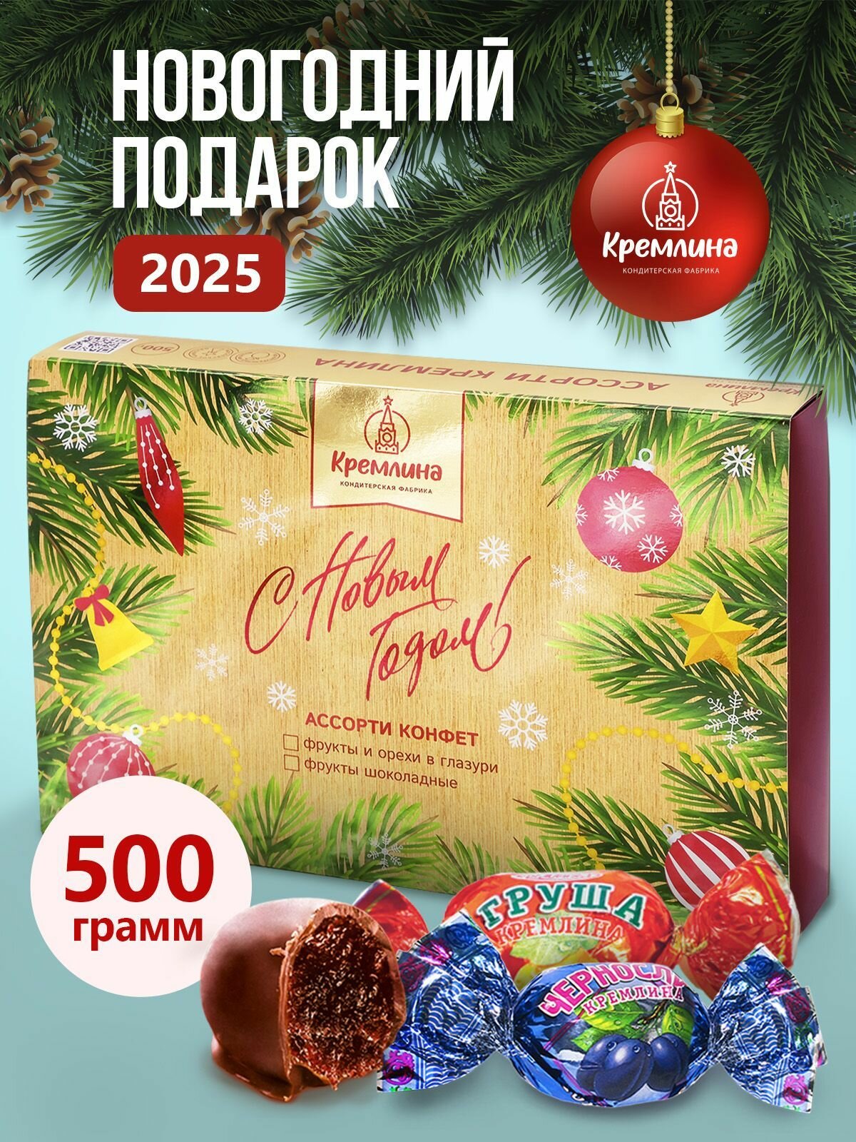 Конфеты подарочные на новый год 2025 Ассорти Кремлина фрукты шоколадные: Манго, Груша, Апельсин, Финик и Инжир в коробке подарочной "С новым годом!" 500 г информация: