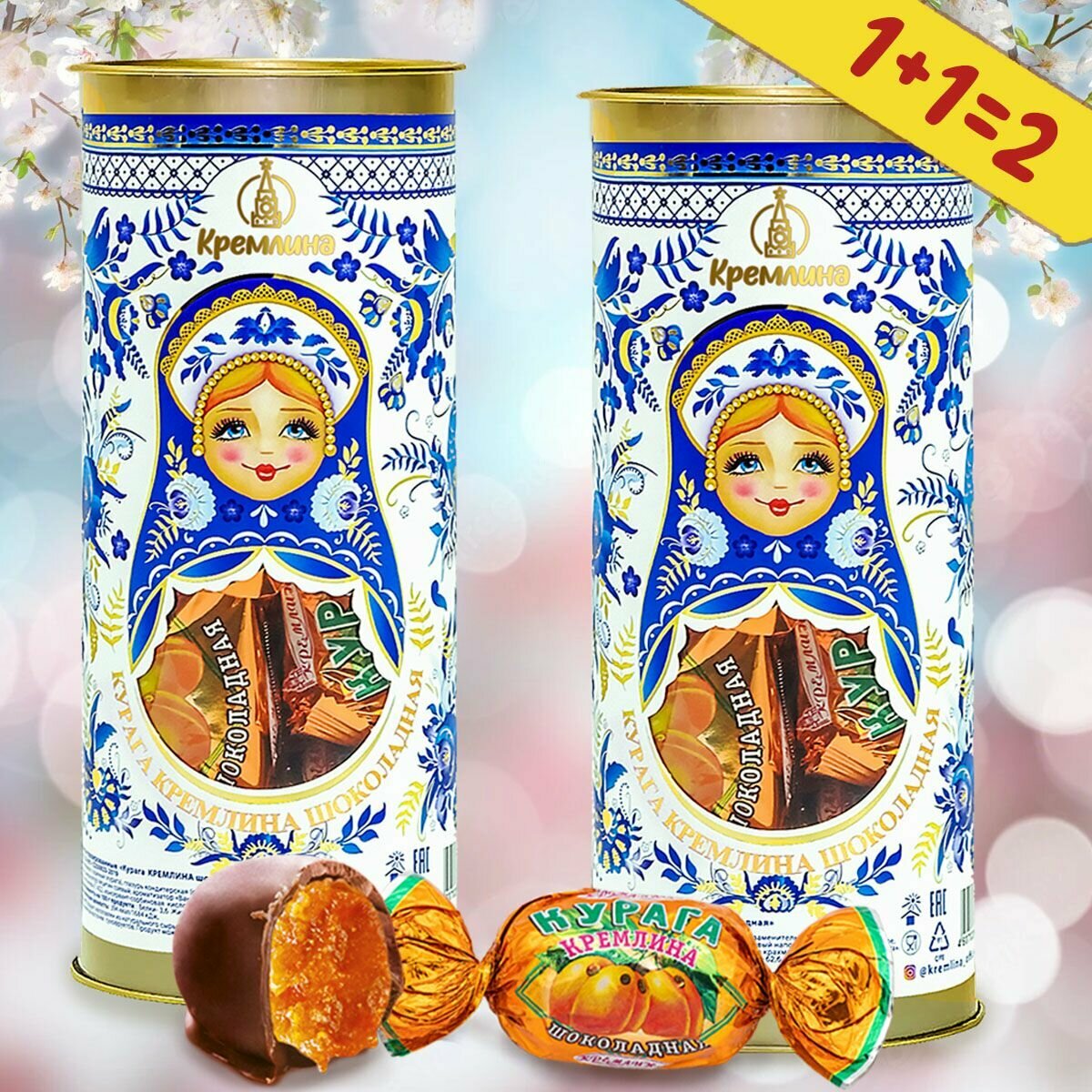 Подарок на Новый Год, набор конфет подарочных Курага Шоколадная в тубах "Матрешка Гжель" , спайка 2 тубы по 250 грамм информация: