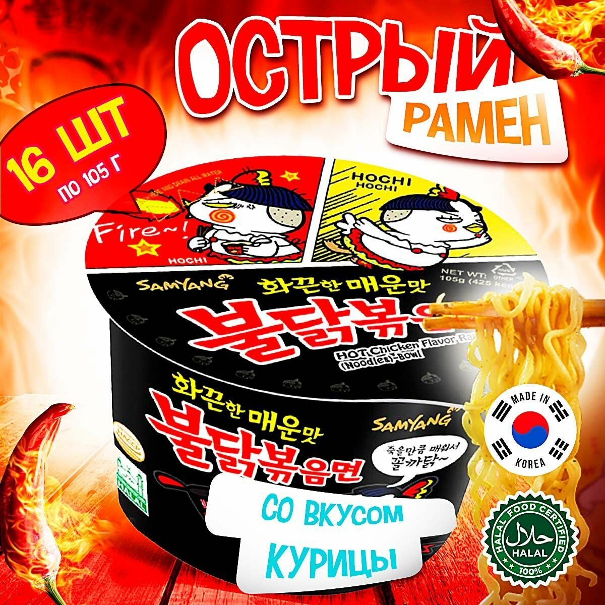 10 цен на Лапша быстрого приготовления Hot Chicken острая курица Samyang, чашка 105 г х 16 шт