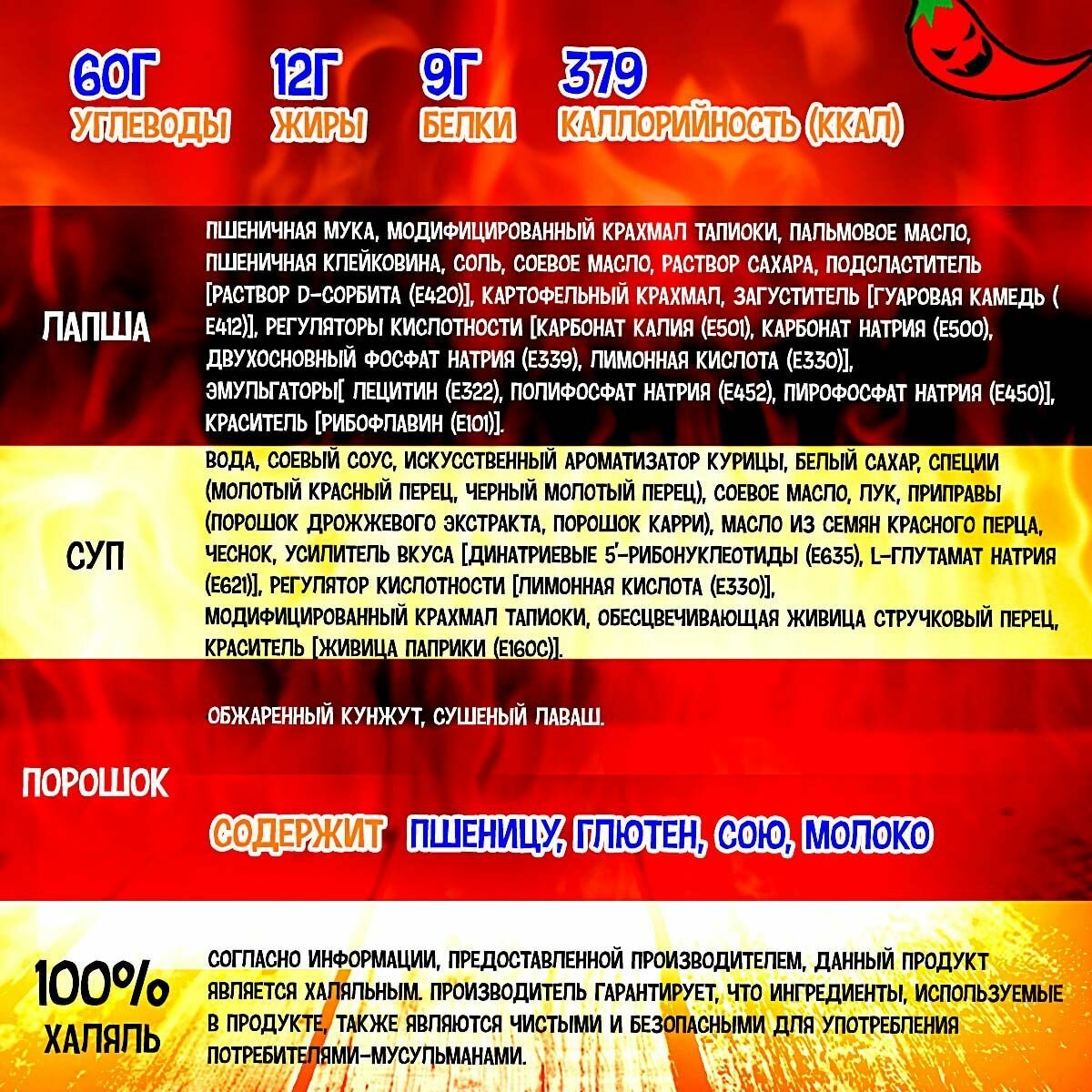 | Состав | Лапша (76,7%): пшеничная мука (52%), пальмовое масло (11%), тапиока (12%), пшеничный глютен, соль, соевое масло, вода, загуститель Е412, регулятор кислотности Е501, Е500, Е339, Е330, эмульгатор. Е322, цвет Е101. Суповая основа (22,7%): вода, приправа (куриный ароматизатор 0,85%, дрожжевой экстракт), сахар, соевый соус (вода, соевые бобы, пшеница, соль), порошок красного сладкого перца, соевое масло, сахар, чеснок, экстракт чили, соль, порошок лука, крахмал тапиоки, экстракт дрожжей, черный перец, порошок карри. Хлопья (0,6%): семена кунжута, водоросли |