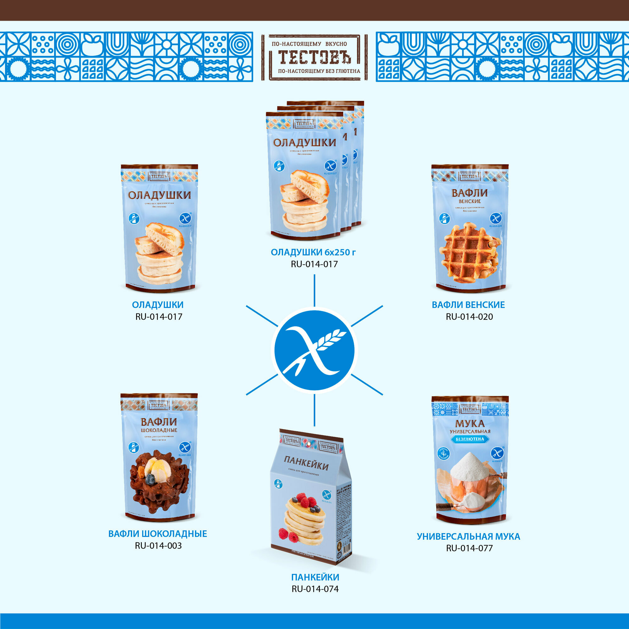| Дополнительная информация | Смеси изготавливаются на обособленном производстве, где полностью исключён контакт с пшеничной мукой, а готовая выпечка не уступает по вкусу традиционной на пшеничной муке. Вы никогда бы не подумали, что безглютен может быть таким вкусным! |