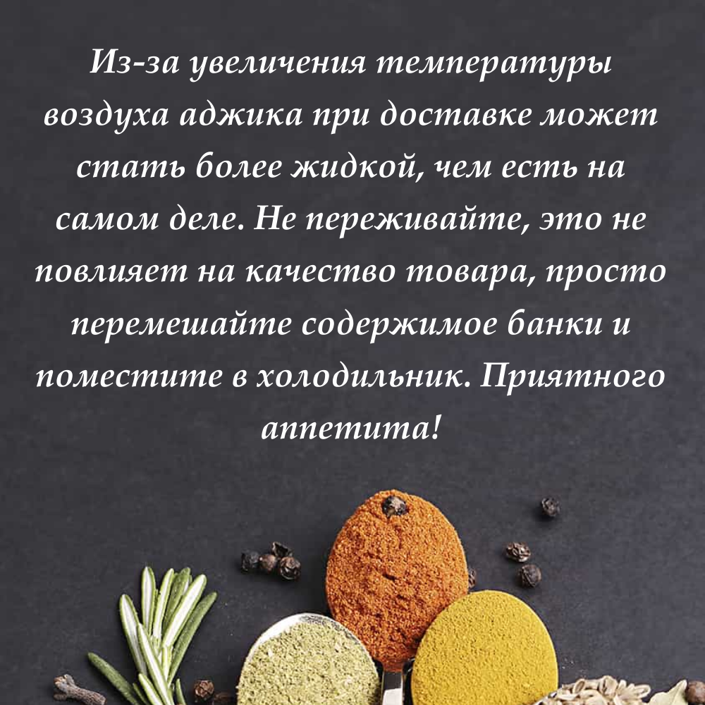 | Состав | Перец красный острый, чеснок, соль поваренная, уцхо сунели, киндза сушенная, вода. |