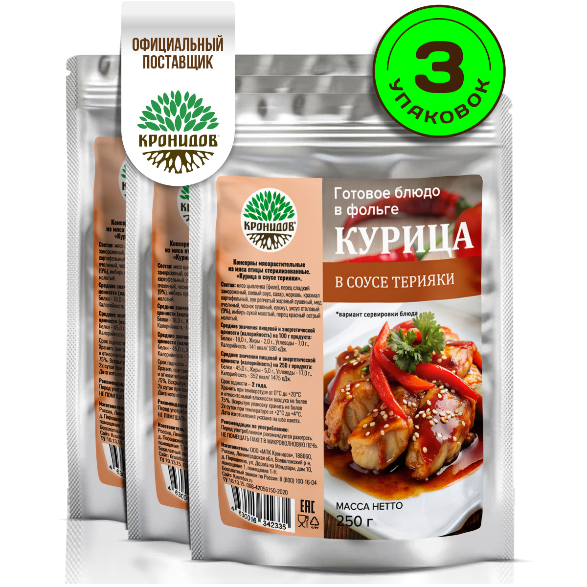 Кронидов Курица в соусе терияки Готовое блюдо в реторт-пакете Консервы натуральные Набор 3 шт. по 250 г информация: