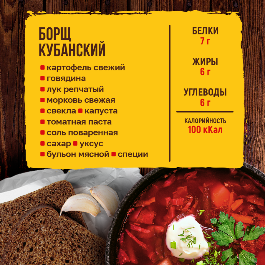 | Состав | Картофель свежий, говядина, лук репчатый, морковь свежая, свекла, капуста, томатная паста, соль, сахар, уксус, вода, специи, соус кулинарный |