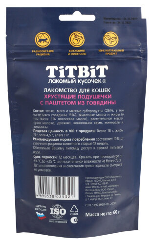 TitBit 60г Хрустящие подушечки для кошек с паштетом из говядины информация:
