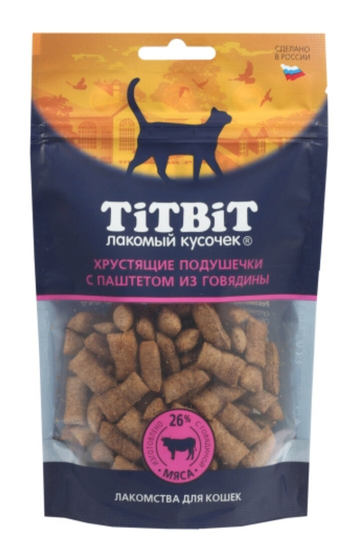 10 цен на TitBit 60г Хрустящие подушечки для кошек с паштетом из говядины
