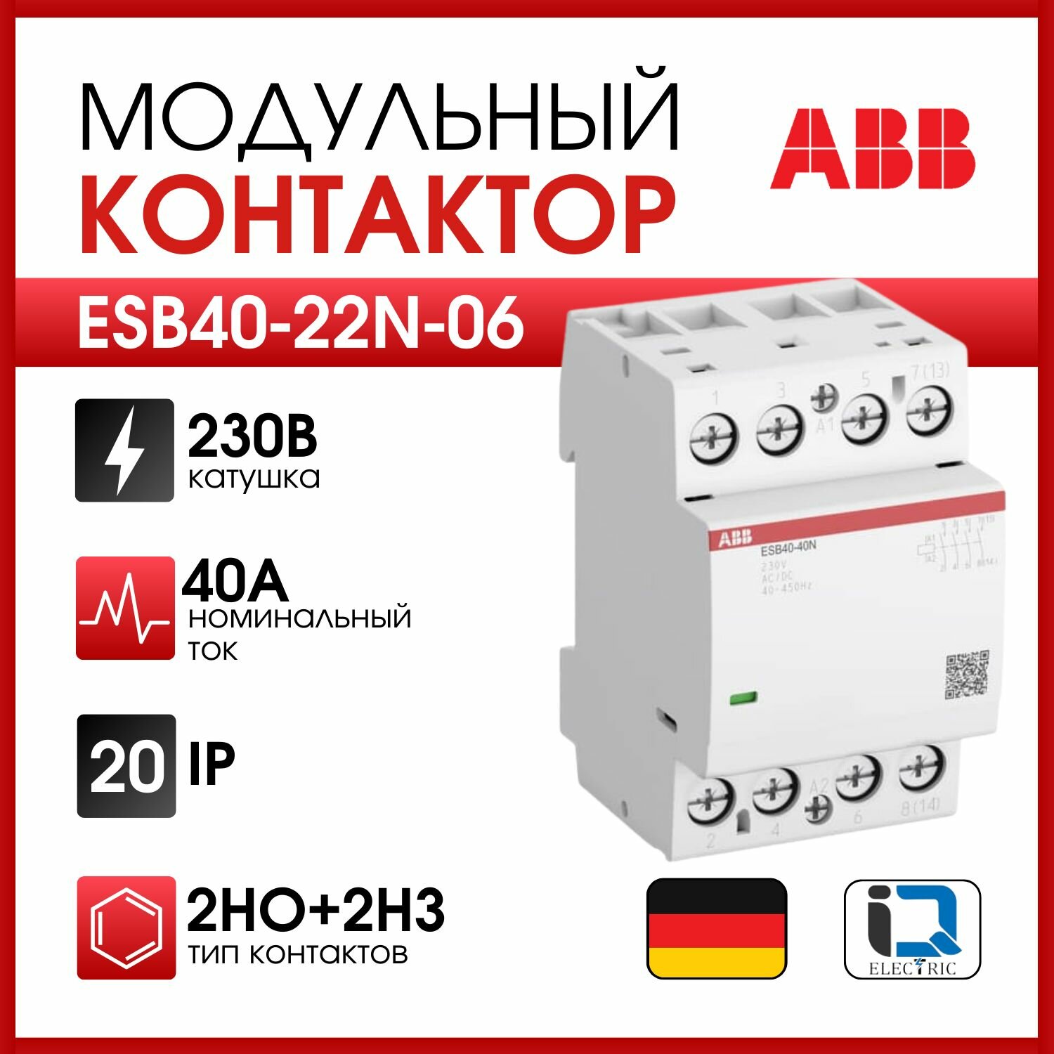 Контактор ESB40-22N-06 модульный (40А АС-1, 2НО+2НЗ), катушка 230В AC/DC, ABB 1SAE341111R0622 (1 шт.)