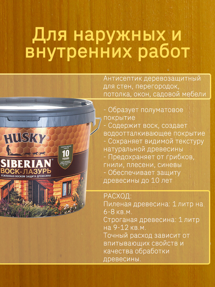 Хаски / Воск-лазурь для древесины, пропитка антисептик для дерева, декоративно-защитный состав HUSKY SIBERIAN калужница (9л) информация: