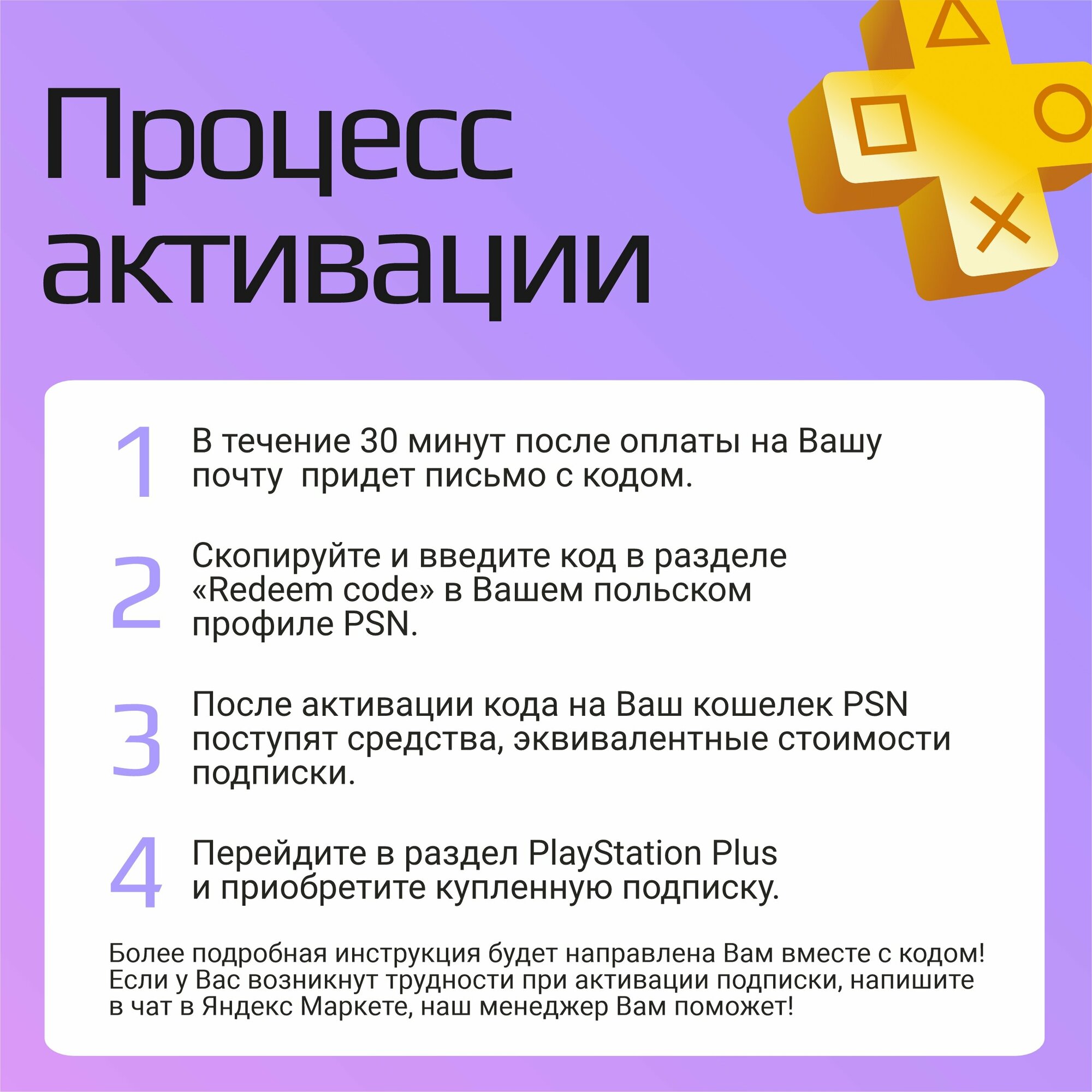 | Инструкция по активации | После покупки Вам придет код (1 или несколько) на почту. Инструкция по активации: 1. Зайдите в свой польский профиль в PSN; 2. Откройте раздел Redeem code; 3. Введите полученный код (если их несколько, то каждый код вводится отдельно); |