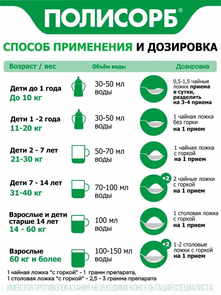 | Способ применения и дозы | Полисорб МП принимают внутрь только в виде водной суспензии!Для получения суспензии необходимое количество препарата тщательно размешивают в 1/4 - 1/2 стакана воды.Рекомендуется готовить свежую суспензию перед каждым приемом препарата и выпивать ее за 1 час до еды или приема других лекарств.Средняя суточная доза у взрослых 0,1 - 0,2 г на 1 кг массы тела (6-12 г).Препарат принимается в 3-4 приема в течение суток.Максимальная суточная доза у взрослых 0,33 г на 1 кг массы тела (20 г). В случаях пищевой аллергии препарат принимается непосредственно перед приемом пищи, суточную дозу Полисорб МП разделяют в течение дня на три приема. Длительность лечения зависит от диагноза и тяжести заболевания, курс лечения при острых интоксикациях 3-5 дней; при аллергических заболеваниях, хронических интоксикациях продолжительность лечения до 10-14 дней. Повторные курсы спустя 2-3 недели, по рекомендации врача. |