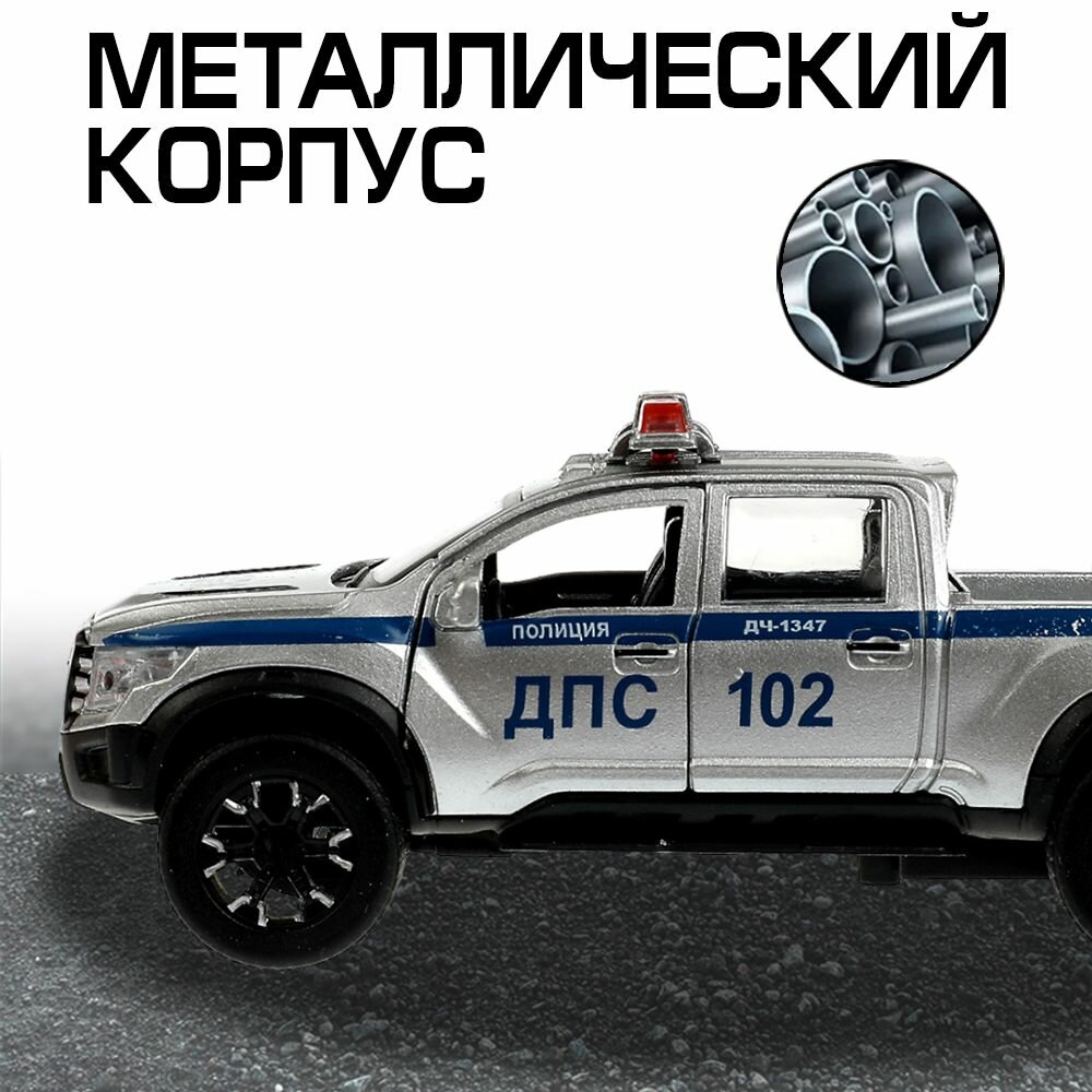 Машинка детская Nissan Titan Warrior Полиция 12.5 см, Технопарк, серебристая, открываются двери, металлический корпус, свет и звук информация:
