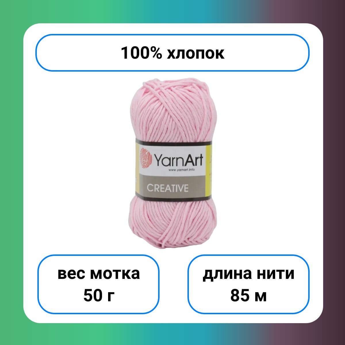 Пряжа YarnArt Creative 50г, 85м (ЯрнАрт Креатив) Нитки для вязания, 100% хлопок, цвет 225 пудра, 1шт
