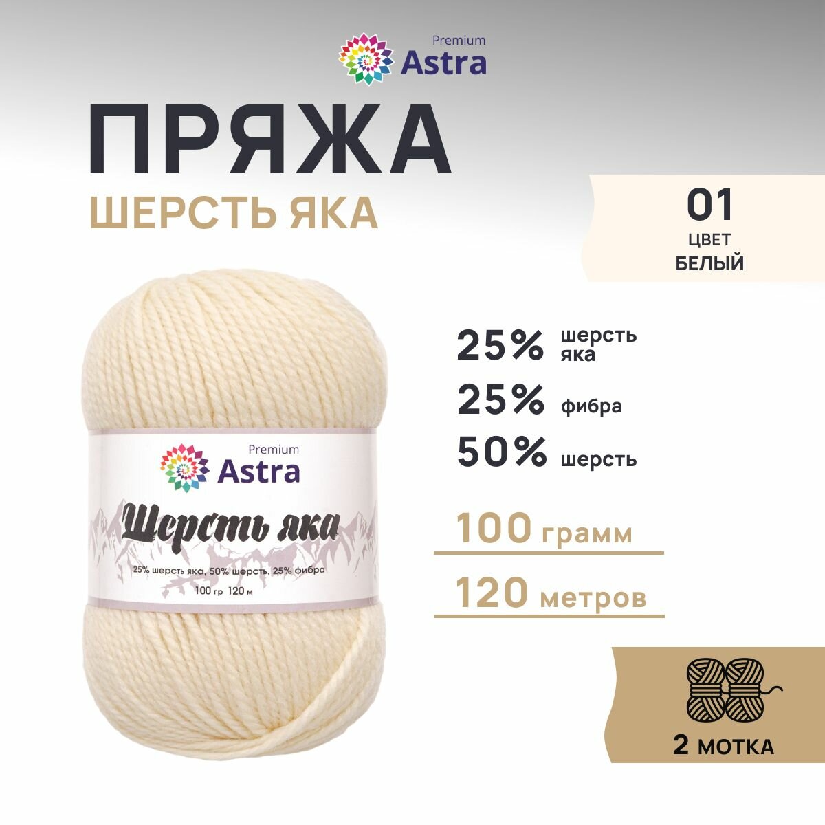 Пряжа для вязания Astra Premium 'Шерсть яка' (Yak wool) 100гр 120м (+/-5%) (25% шерсть яка, 50% шерсть, 25% фибра) (01 белый), 2 мотка