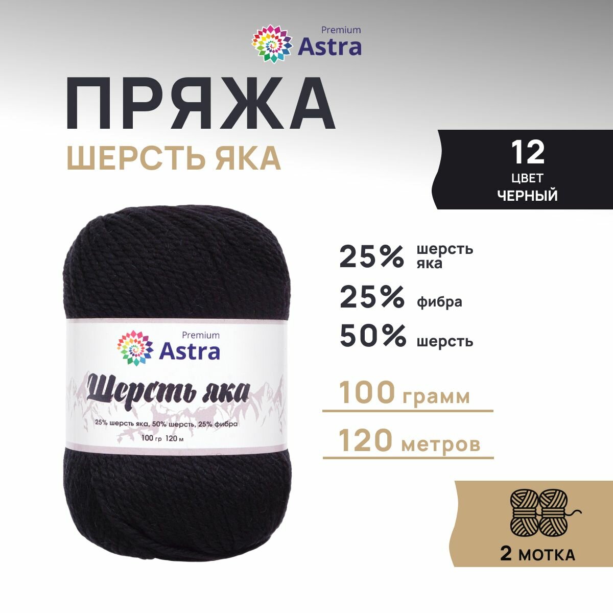 Пряжа для вязания Astra Premium 'Шерсть яка' (Yak wool), 100 г, 120 м (+/-5%) (25% шерсть яка, 50% шерсть, 25% фибра) (12 черный), 2 мотка 803 ₽