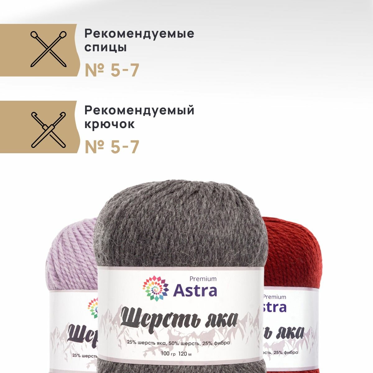 Пряжа для вязания Astra Premium 'Шерсть яка' (Yak wool), 100 г, 120 м (+/-5%) (25% шерсть яка, 50% шерсть, 25% фибра) (06 молочный), 2 мотка 892 ₽