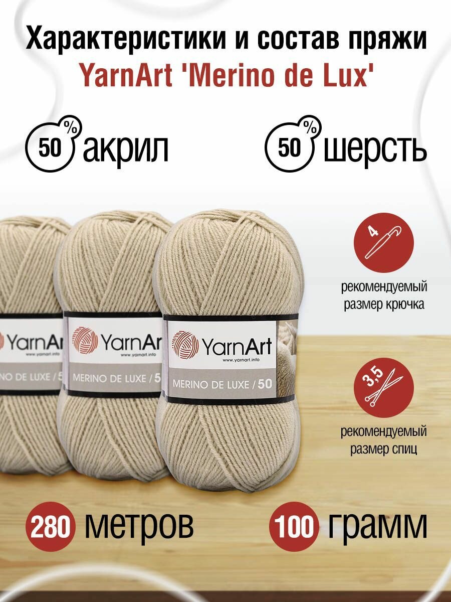 Пряжа для вязания YarnArt 'Merino de Lux' 100г, 280м (50% шерсть, 50% акрил) (218 бежевый), 5 мотков 1 537 ₽