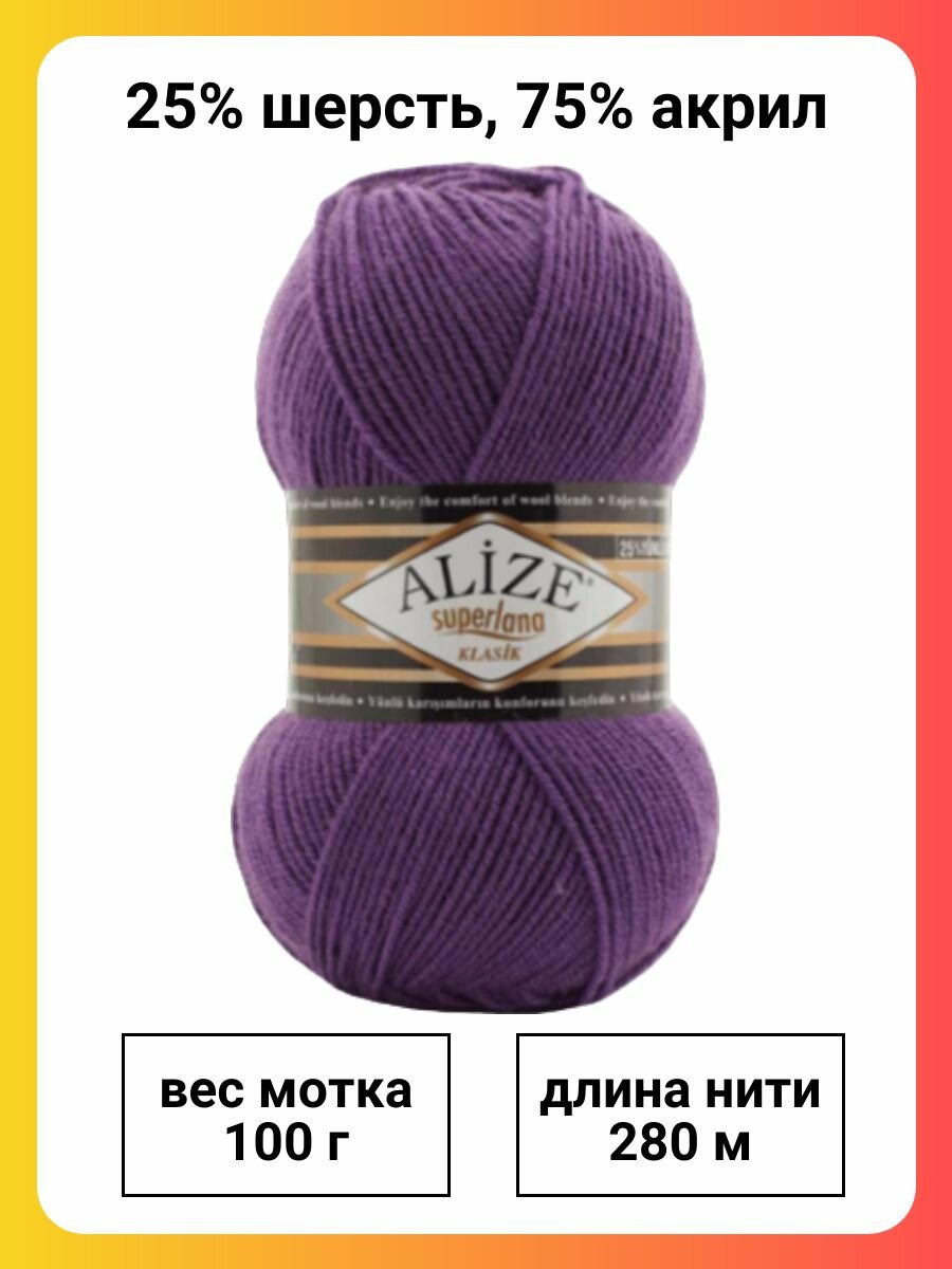 Пряжа Alize Superlana klasik (Ализе Суперлана Классик) - 2 мотка 44 темно-фиолетовый 25% шерсть, 75% акрил 100г/280м 545 ₽