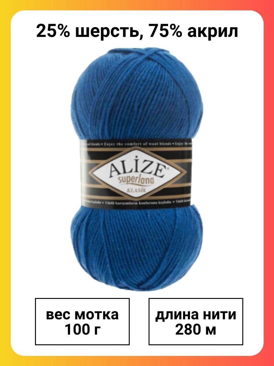 Пряжа Alize Superlana Klasik 141 василек, 100 г, 280 м, 5 штук информация: