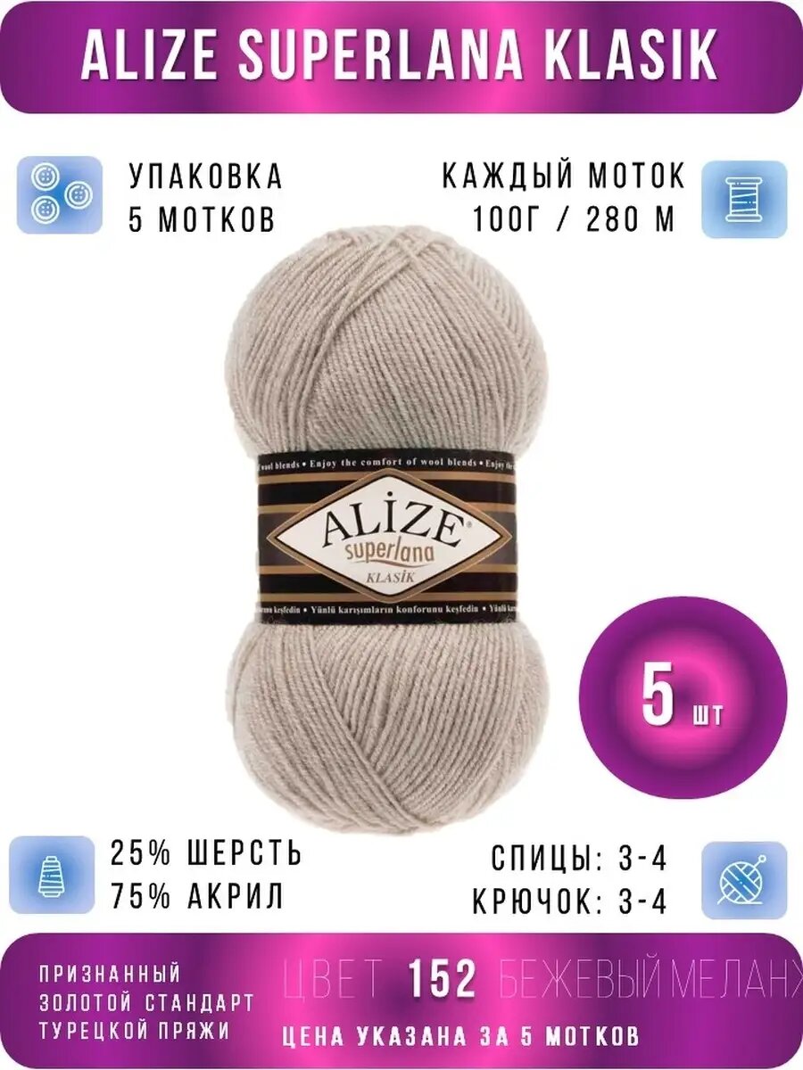 Отзывы на Пряжа для вязания ALIZE 'Superlana klasik', 100г, 280м (акрил, шерсть), ТУ (152 беж меланж), 5 мотков
