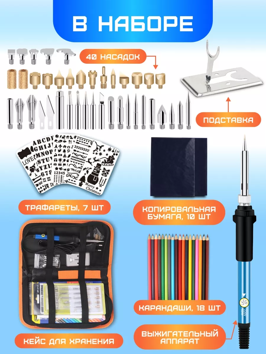 | Подробная комплектация | 40 насадок, подставка, трафареты - 7 шт, копировальная бумага 10 шт, кейс для хранения, карандаши - 18 шт, выжигательный аппарат |
