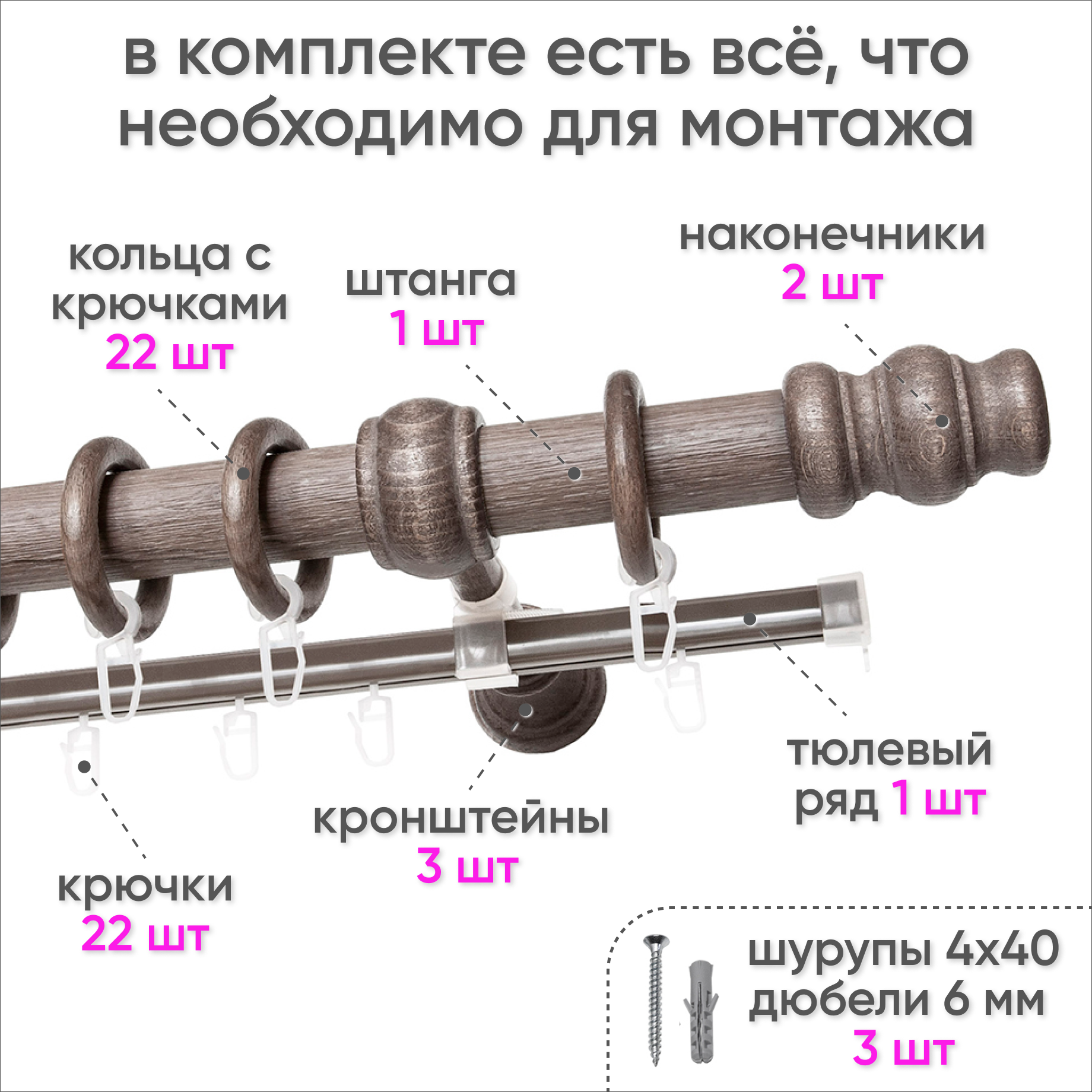 | Комплектация | Штанга, кронштейны, кольца, крючки, наконечники, вторая направляющая, заглушки, комплект креплений, инструкция |