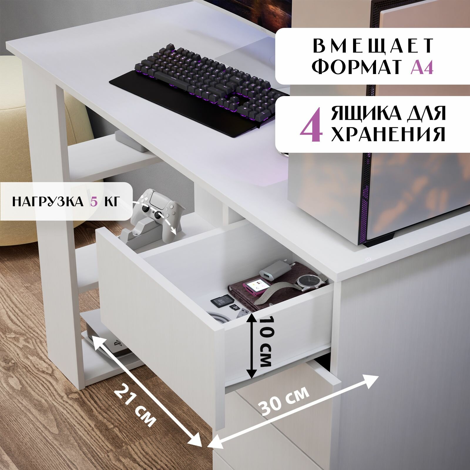 Компьютерный стол LETTA, белый, с ящиками, ЛДСП, 105,6 x 75 x 45 см 4 505 ₽