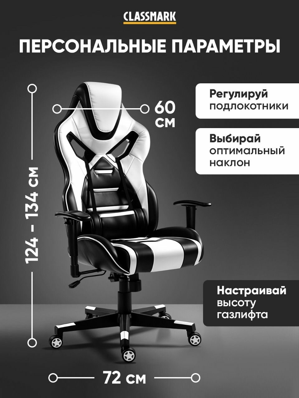 10 цен на Кресло компьютерное игровое Classmark K240223-7 до 150 кг, с подлокотниками, геймерское, с подголовником, белый и черный