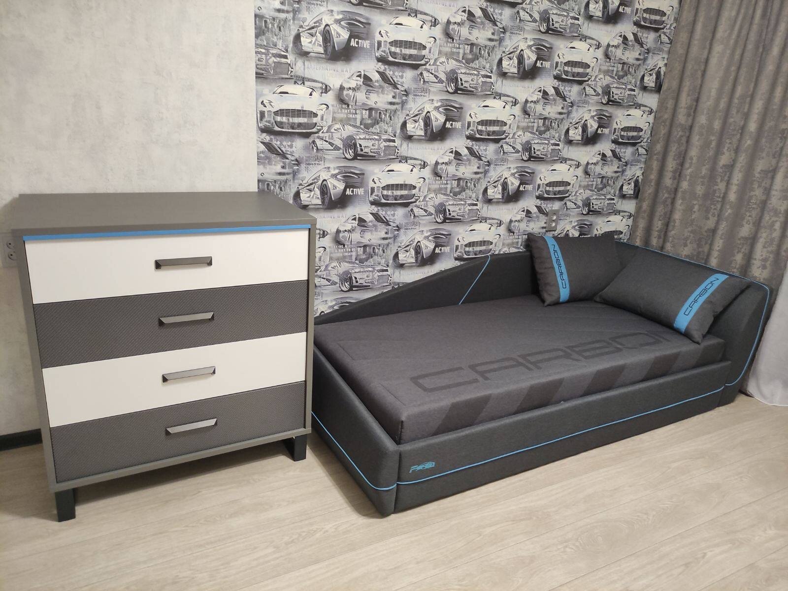 Фабрика Мирлачёва кровать для подростка CARBON-NEW, размер 90х190, реечное основание с подъемным механизмом, изголовье слева, кант голубой 26 928 ₽
