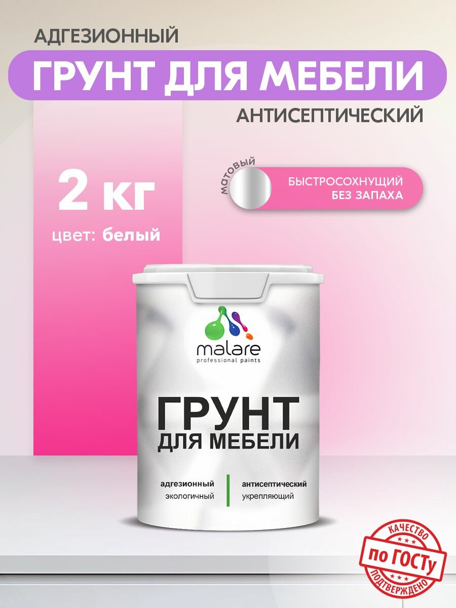 Грунт для мебели Malare акриловый адгезионный укрепляющий быстросохнущий без запаха, белый, 2 кг. информация: