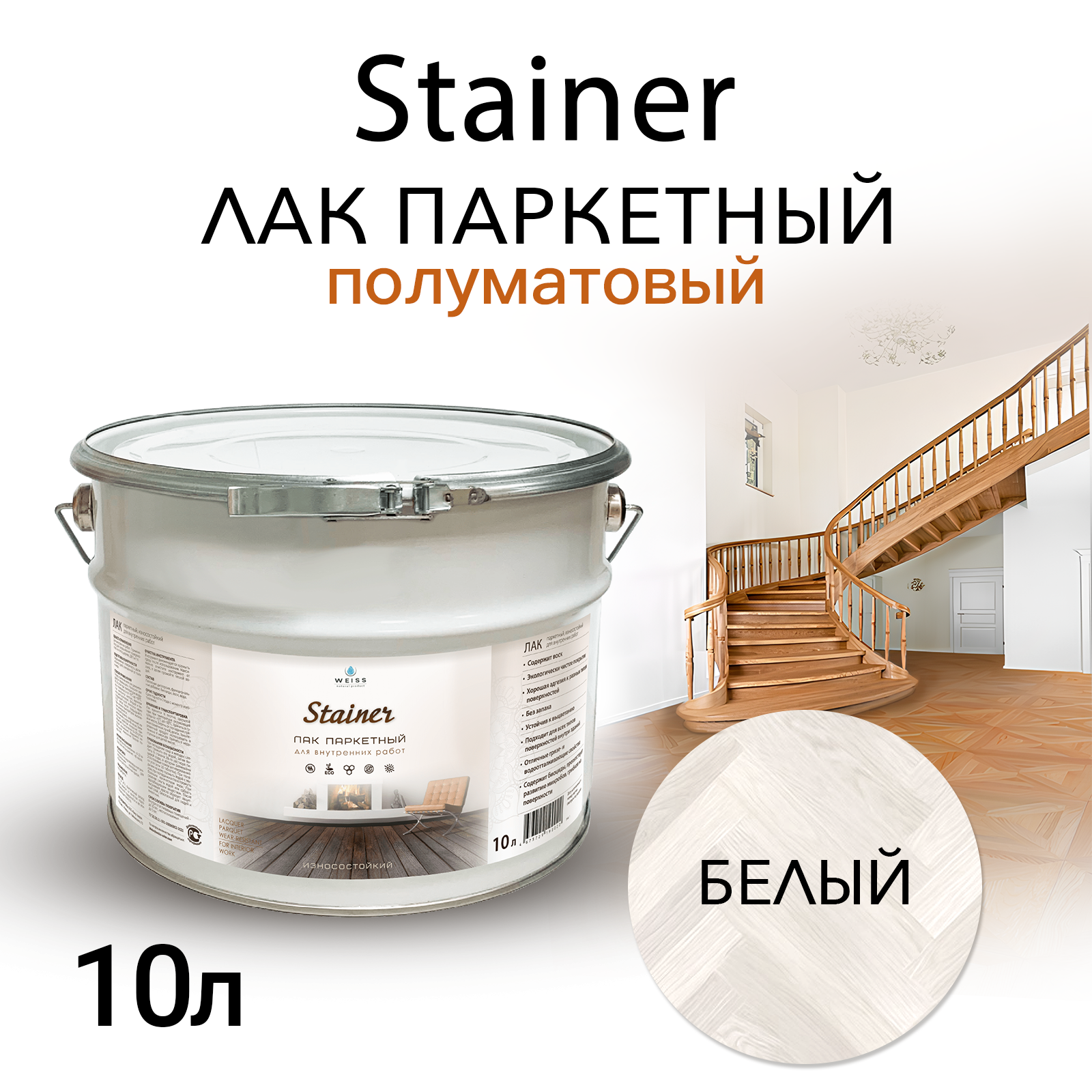 Лак строительный паркетный белый полуматовый, для пола, для паркета, для стен, для мебели, для дерева Weiss natural product без запаха самовыравнивающийся 10л информация: