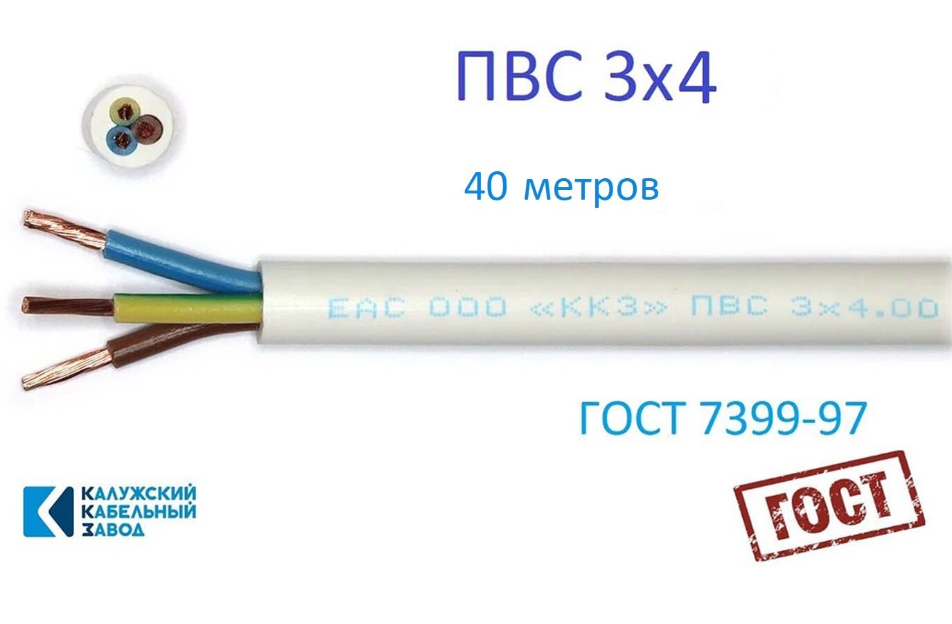 Провод ПВС 3х4 ГОСТ Калужский Кабельный Завод (Белый) 40 метров информация: