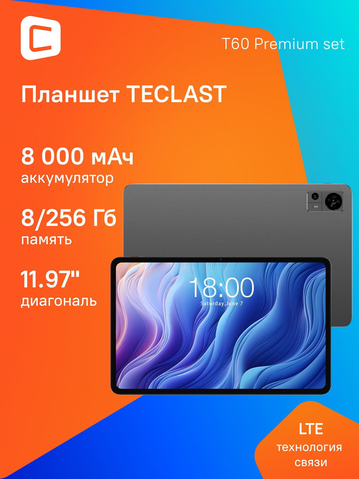 11.97" Планшет TECLAST T60 Premium set 8/256 GB T620 4G, 2000 x 1200, 90Гц, Android 14, с чехлом и клавиатурой, серый информация: