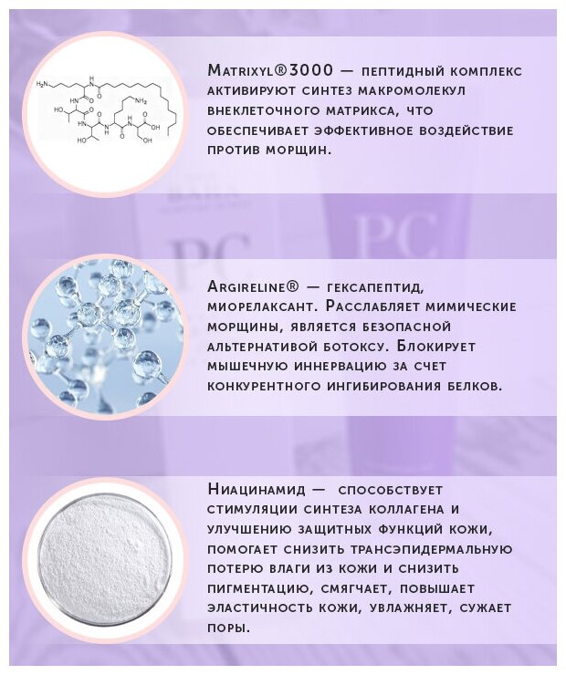| Активный ингредиент | AHA-кислоты / аденозин / азелаиновая кислота / аллантоин / антиоксиданты / арбутин / бакучиол / бетаин / биофлавоноиды / витамин A (ретинол) / витамин B3 (ниацинамид) / витамин B5 (пантотеновая кислота) / витамин C (аскорбиновая кислота) / витамин E / витамины / гиалуроновая кислота / гидрохинон / глицерин / кератины / койевая кислота / коллаген / комплекс витаминов / кофеин / лецитин / мадекассосид / молочная кислота / пантенол (провитамин B5) / пептиды / салициловая кислота / сквалан / сок алоэ / центелла азиатская / церамиды |