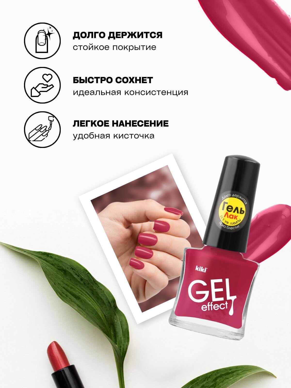 Лак для ногтей kiki Gel Effect тон 27 красно-розовый с гелевым эффектом без уф-лампы, цветной глянцевый маникюр и педикюр, кики, 6 мл 164 ₽