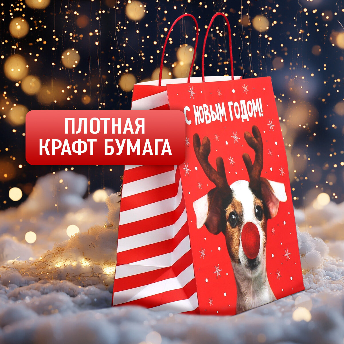 10 цен на Пакет подарочный крафтовый, «Олень ты», 28 х 32 х 15 см, красный, для упаковки подарка на Новый год