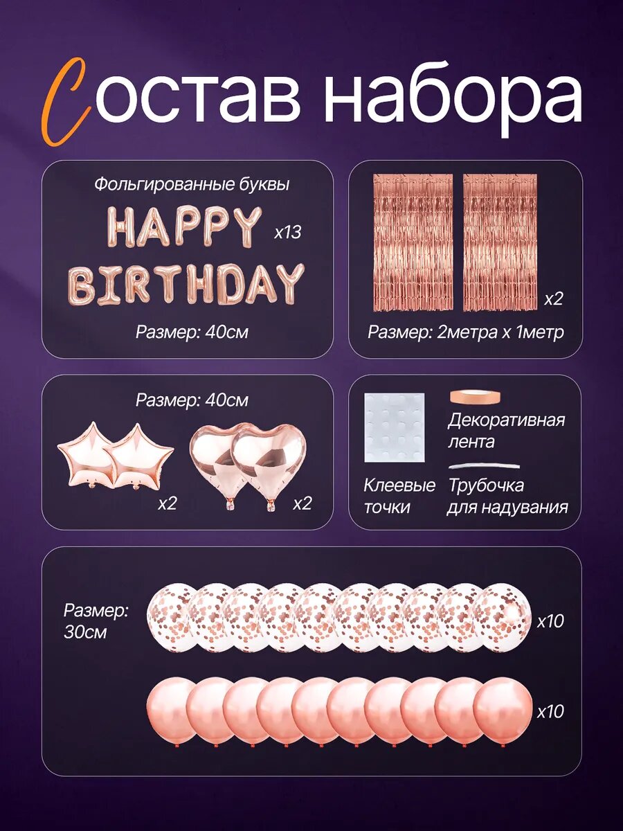 | Подробная комплектация | Шары-буквы Happy Birthday 40 см, шар сердце розовый 40 см - 2 шт., шар звезда розовый 40 см - 2 шт., шар конфетти 30 см - 10 шт., шар розовый 30 см - 10 шт., занавес из дождика 2мх1м - 2 шт. |