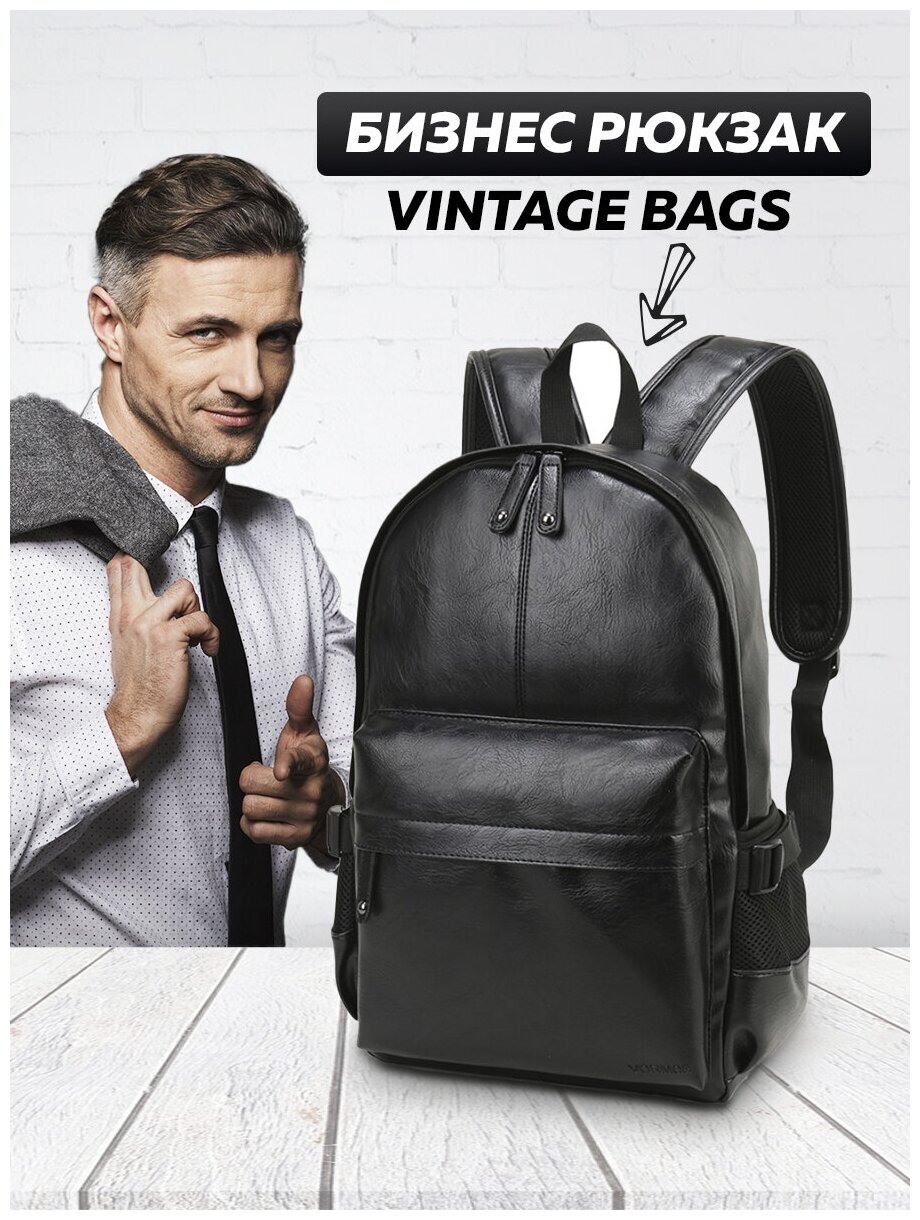 Рюкзак VINTAGE BAGS (Бизнес модель, Черный) кожаный мужской женский дорожный для ноутбука спортивный городской для подростков