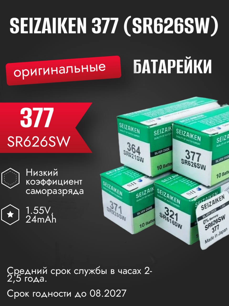 Батарейка SEIZAIKEN 377 (SR626SW) Silver Oxide 1.55V (1 шт.) информация: