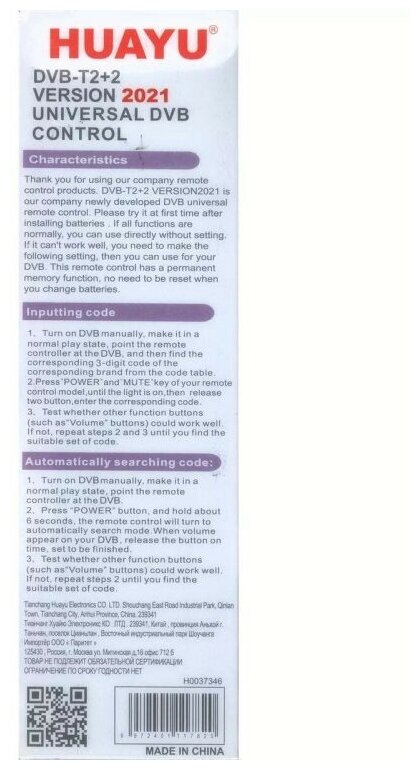 Пульт HUAYU DVB-T2+2 ver.2021 Универсальный информация:
