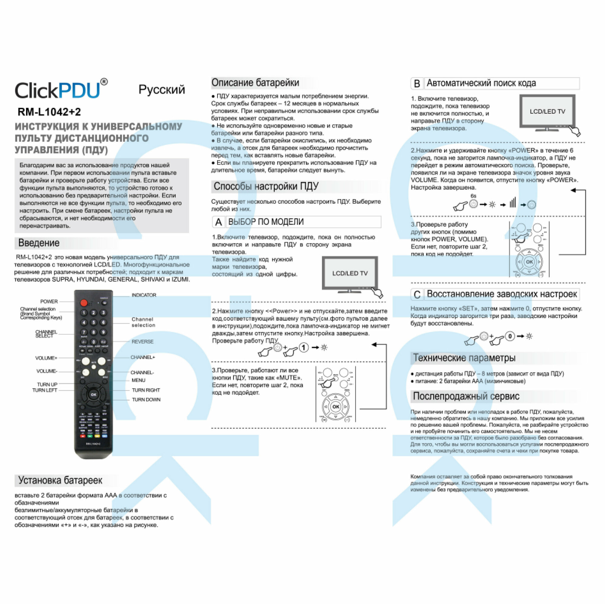 Пульт ClickPdu для Supra , Fusion RM-L1042+2 универсальный информация: