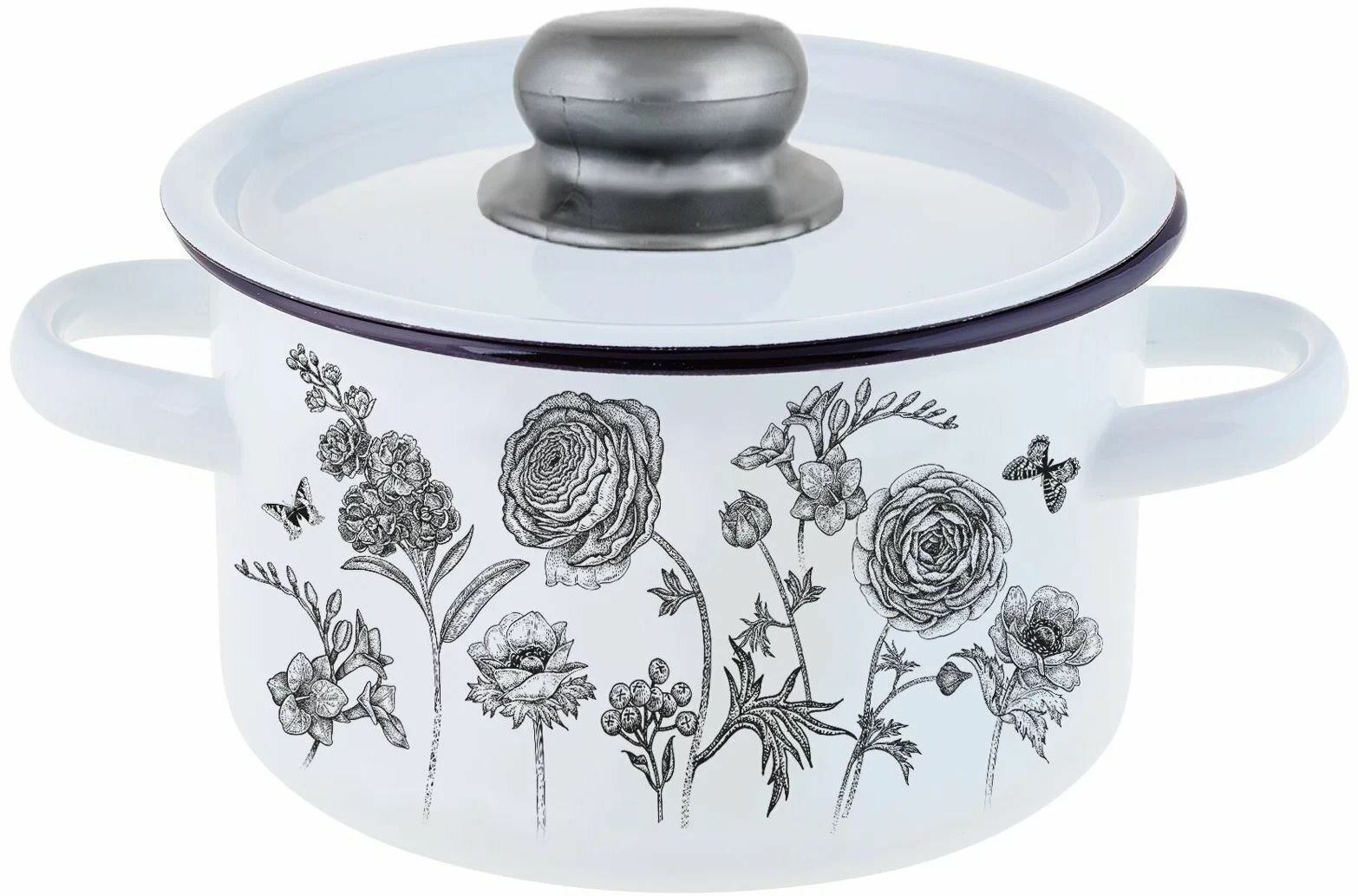 Кастрюля эмалированная 1,5 л с ободком белая с рисунком Фруктовая фантазия