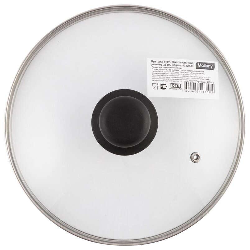 Крышка с ручкой стеклянная 22 см Mallony, с металлическим ободком и паровыпуском, высота 5,6 см